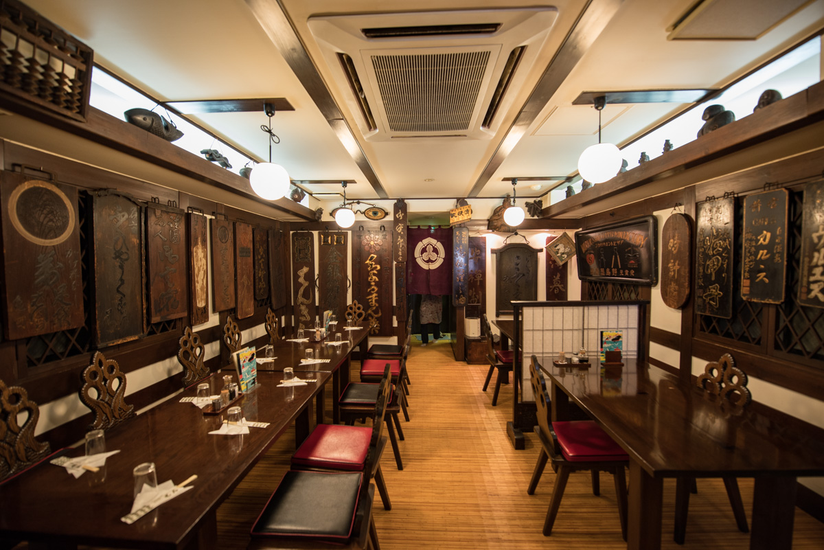 階段で2階へあがるとその先には小さなエレベーターもあった。さすがハイカラだ。テーブル席や小上がり付きの和個室などもあるが、もし予約でリクエストできるのならば、4階がおすすめ。初代店主が趣味で集めた江戸時代の古看板が壁一面にびっしりと展示されており、タイムスリップ感が加速する。