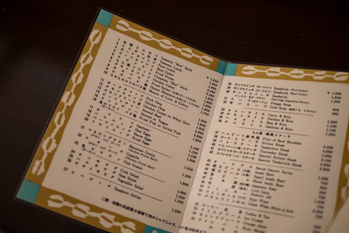 言わずと知れた有名店だが、恥ずかしくもこの時まで知らなかった。「美婦貞奇(ビフテキ)」の看板の横を通り、重厚な扉を開けると1階は喫茶店かバーのようなカウンターが出迎えてくれる。