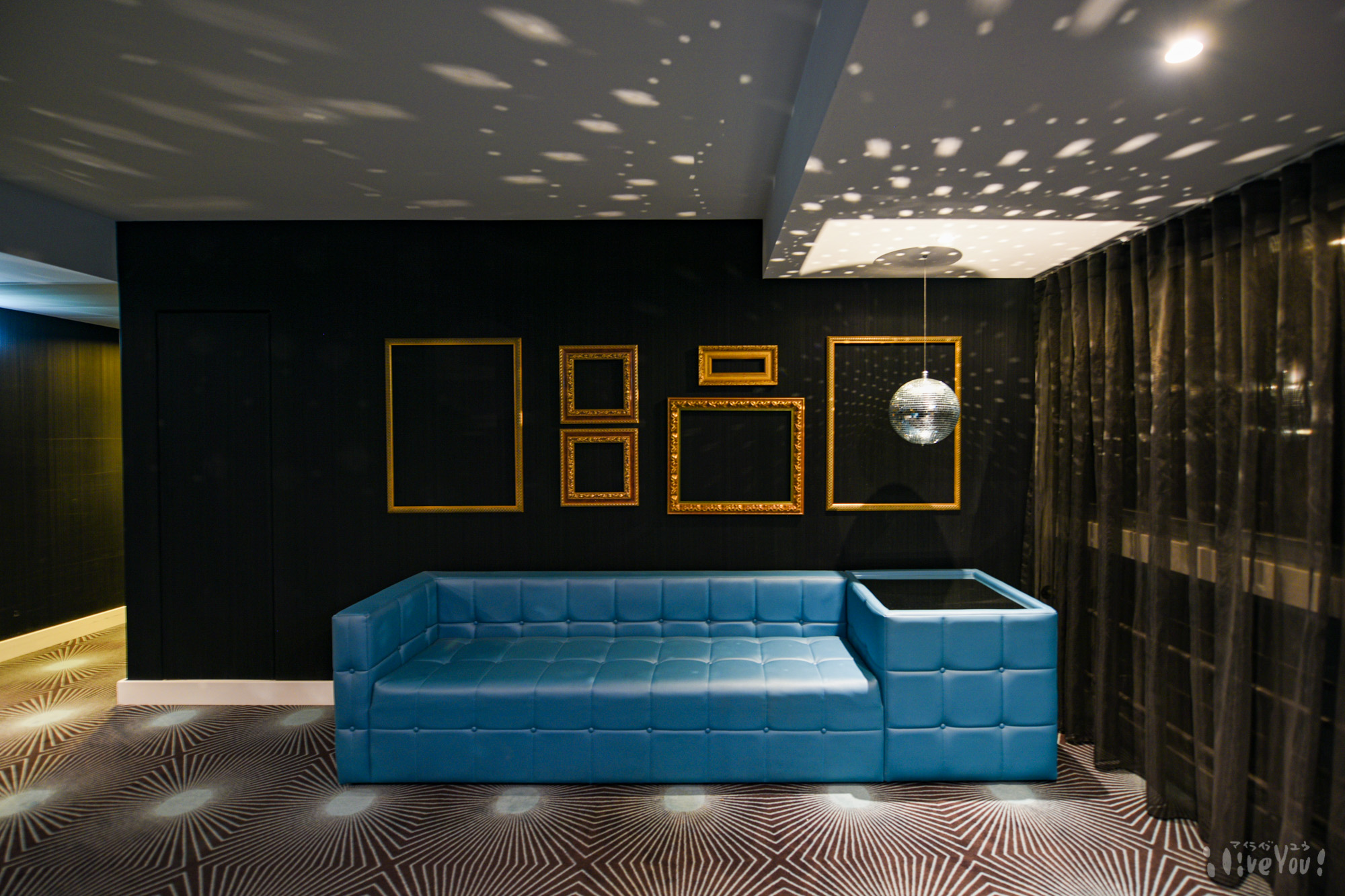 わたしの部屋は10階の「ディスコ」。エレベーターを降りるとミラーボールがお出迎えし、部屋は片面ガラス張りでモダンなインテリアだ。
