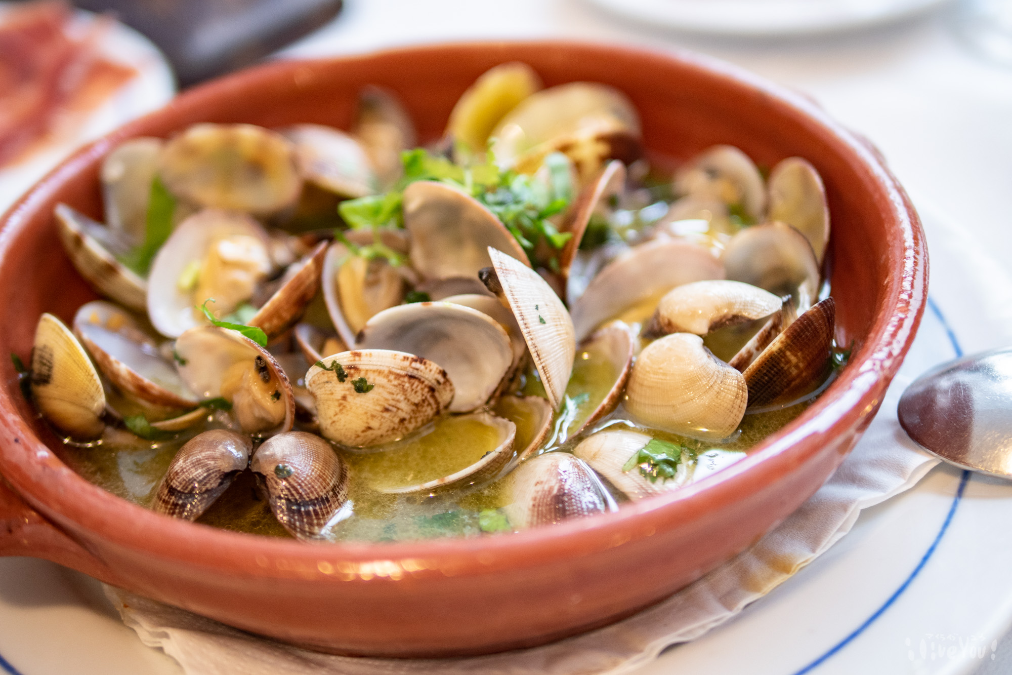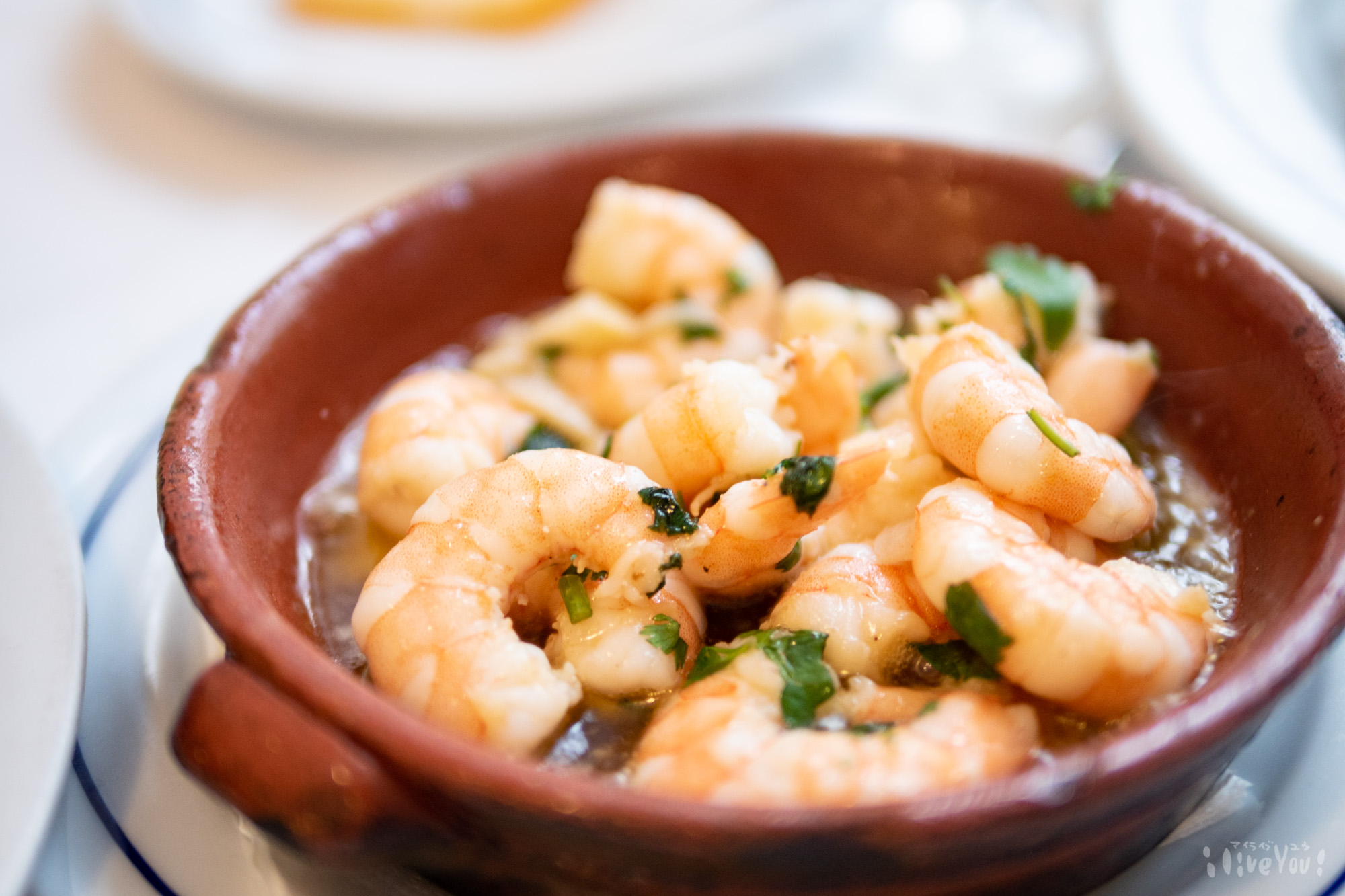 どちらもシンプルな魚介料理だ。白ワインで蒸して、パクチー(コリアンダー)で香り付けしてある。ポルトガル料理にパクチーは欠かせない食材とのことで、パクチニストのわたしには意外なうれしいサプライズ。アサリ、あるいはプリップリの海老からあふれだしたさらに残るスープもおいしくて、お腹をセーブしなくてはと思っても、ついついパンに手が伸びる。表面がカリカリで中はしっとりしたバケットは、スポンジのように皿に残ったスープを吸い、口の中で一品の料理になる。そこへ赤ワインをひとくち。魚介の味が濃くて、赤ワインが負けないのだ。