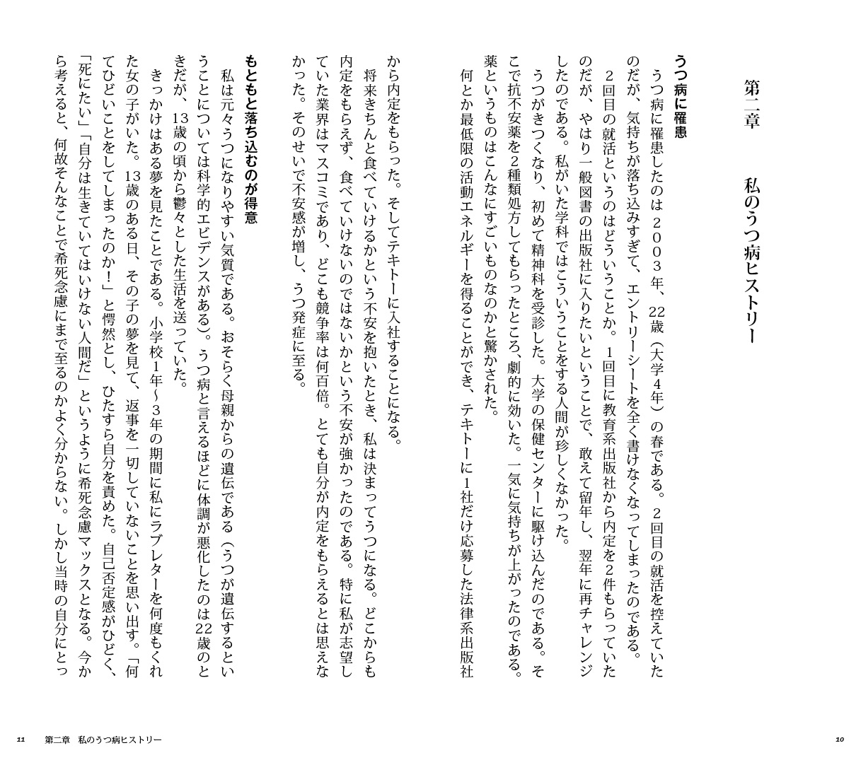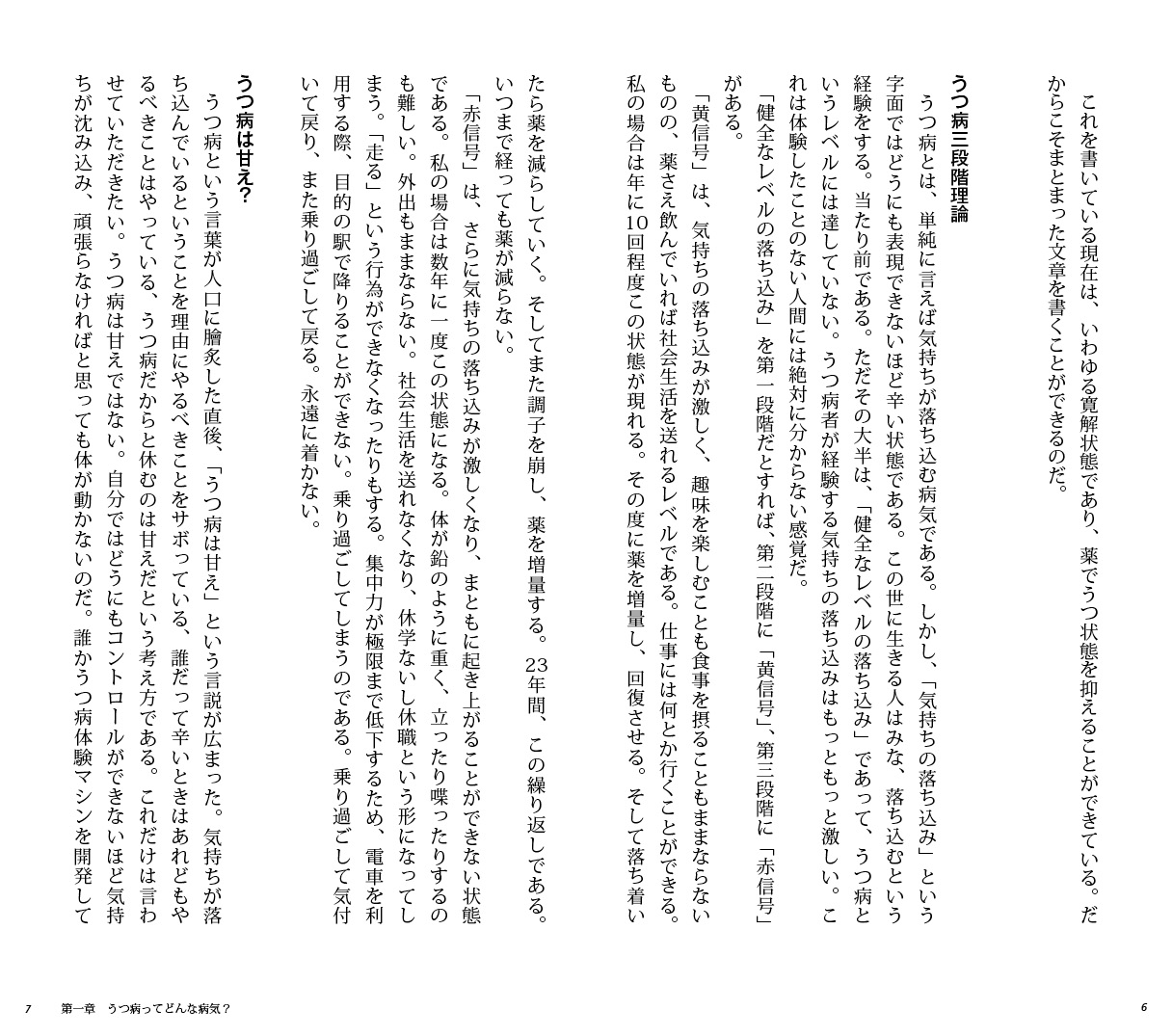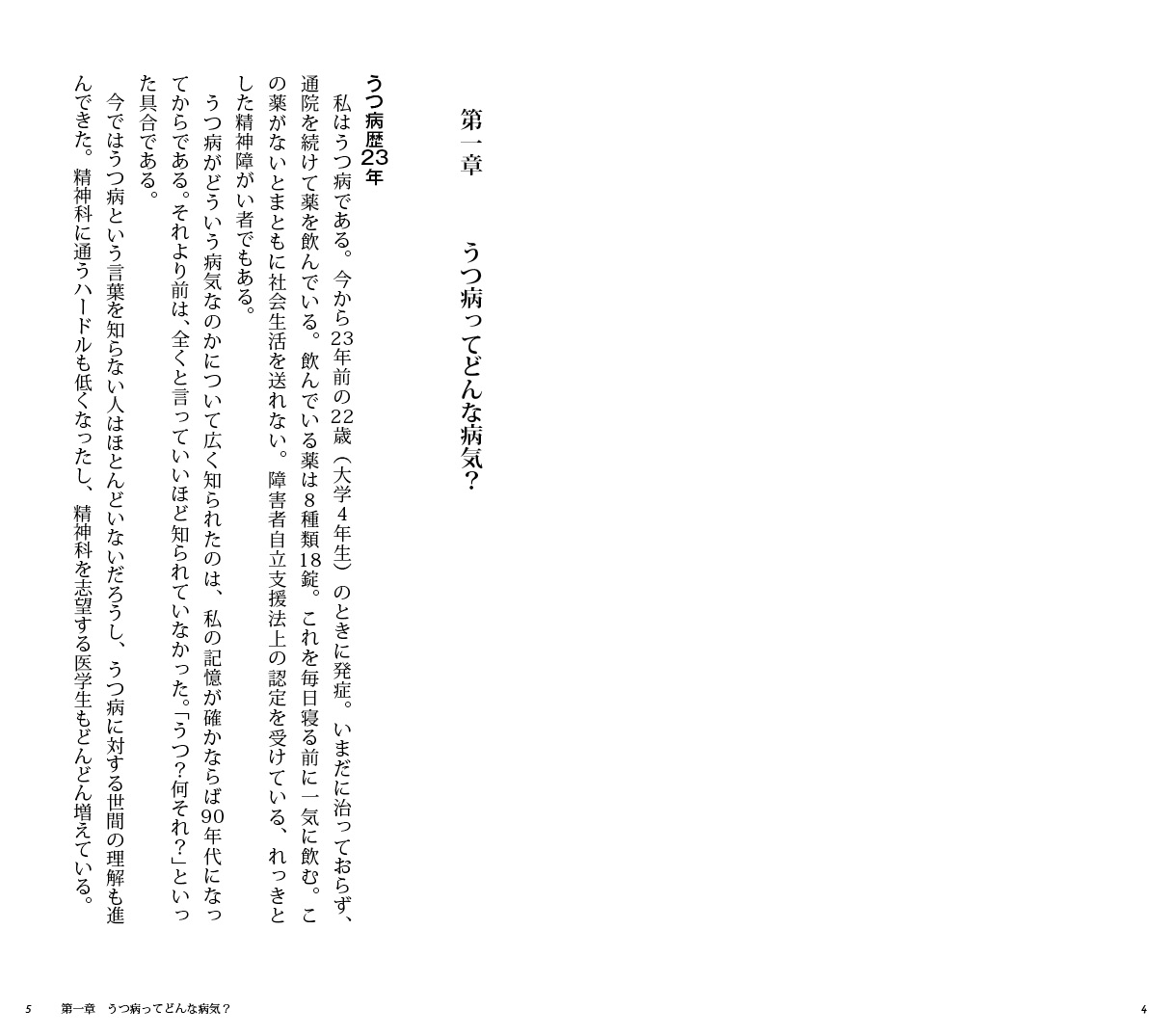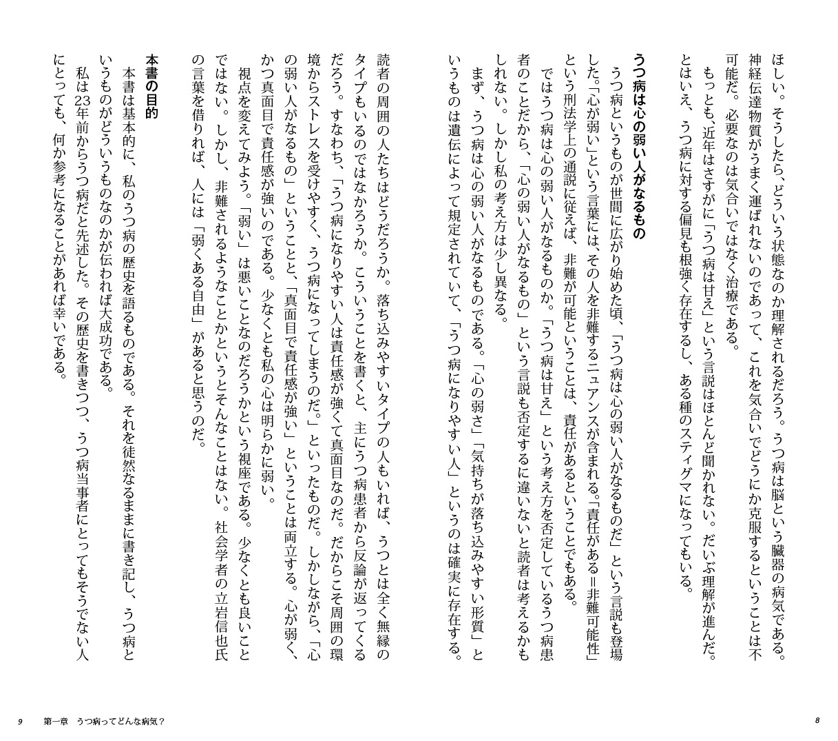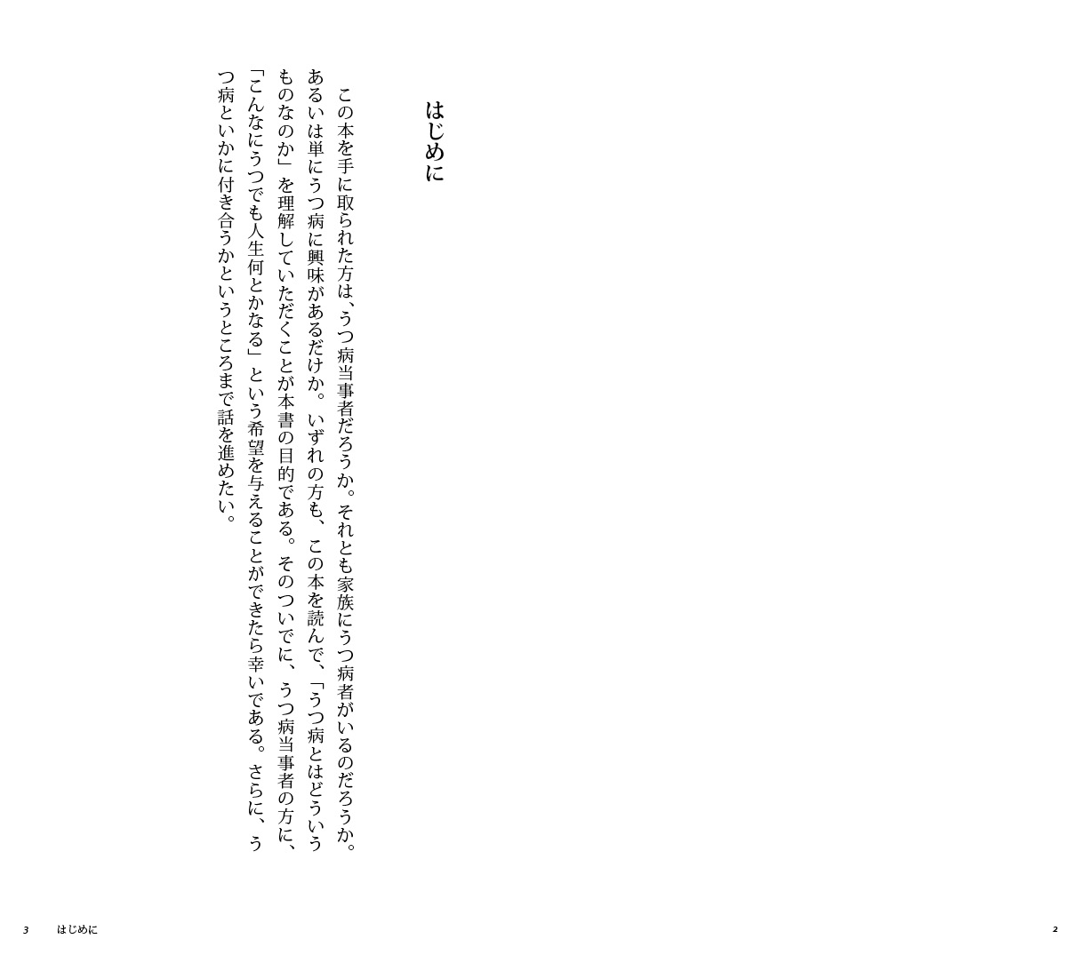 “この本を手に取られた方は、うつ病当事者だろうか。それとも家族にうつ病者がいるのだろうか。あるいは単にうつ病に興味があるだけか。いずれの方も、この本を読んで、「うつ病とはどういうものなのか」を理解していただくことが本書の目的である。そのついでに、うつ病当事者の方に、「こんなにうつでも人生何とかなる」という希望を与えることができたら幸いである。さらに、うつ病といかに付き合うかというところまで話を進めたい。”