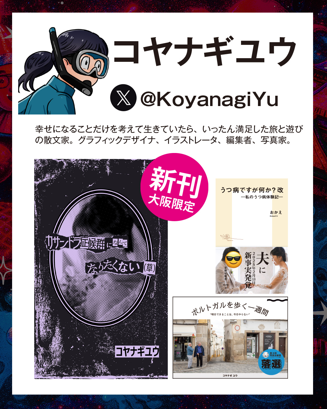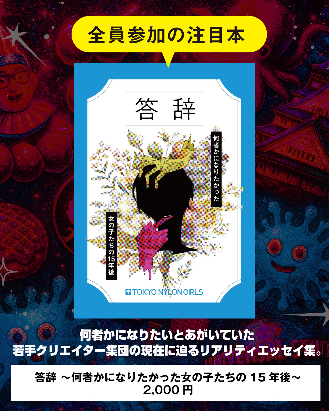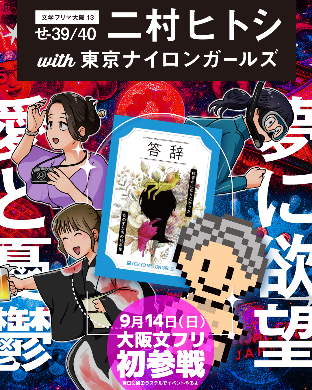 2025年9月13日(日)に、インテックス大阪で行われる「文学フリマ大阪13」に「二村ヒトシwith東京ナイロンガールズ」として、AV監督の二村ヒトシさんと、元東京ナイロンガールズとして(コヤナギユウ、坂野りんこ、大泉りか)と出店します。大阪での参加は初。今回は全員参加の話題書「答辞 〜何者かになりたかった女の子たちの15年後〜」のほか、各々が2〜4冊持ち寄ります。うち1冊からは大阪限定の新刊を発売します。