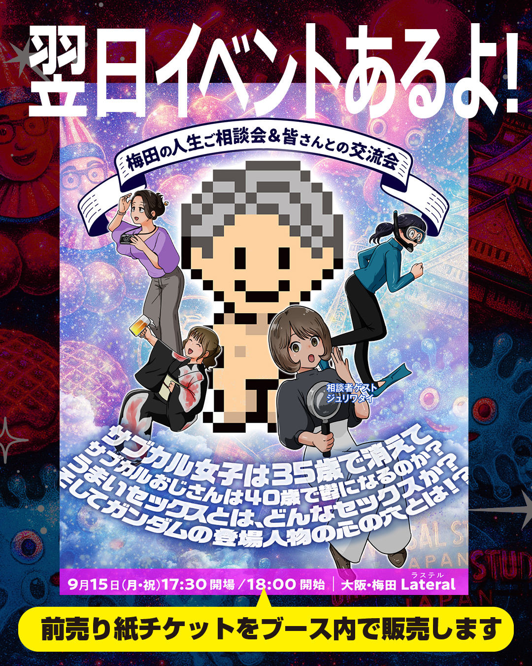 文学フリマ大阪では翌日の相談・懇親会イベント「梅田の人生ご相談会&皆さんとの交流会『サブカル女子は35歳で消えてサブカルおじさんは40歳で鬱になるのか? うまいセックスとは、どんなセックスか? そしてガンダムの登場人物の心の穴とは!?』」の紙チケットも販売予定です。