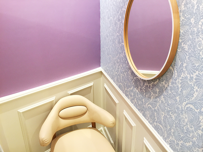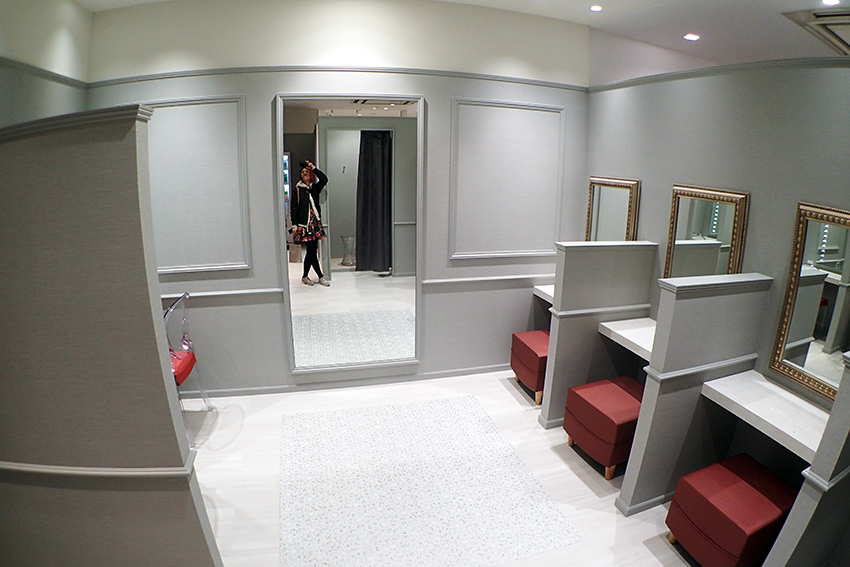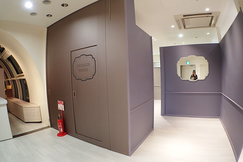 マロニエゲート2の3階にある渡り廊下の前に、なにやらラベンダーカラーのお部屋が。こちら、今回新しく出来た「ドレッサールーム」で、お買い物途中で疲れたときのお休みはもちろん、買ったばかりのお洋服にすぐさま着替えられるドレッサールームや、化粧直しがはかどりそうなハリウッドミラーを完備。利用は無料なのでかしこく使いたい。