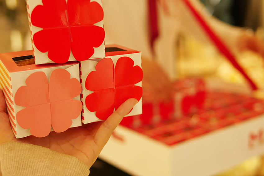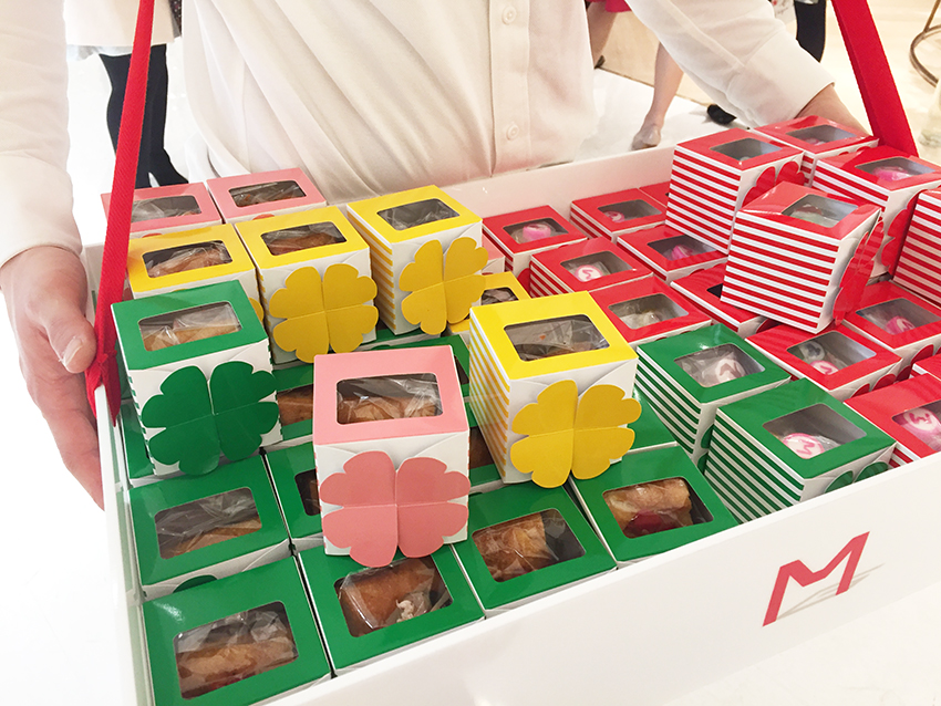中身はHATAKE CAFEのオーガニックなサンドイッチや、サロン・ド・アンジェリーナのマロンサンドショコラ、マロニエゲートのショップを示すようなアイコンみたいなキャンディーなどおもちゃ箱みたい。