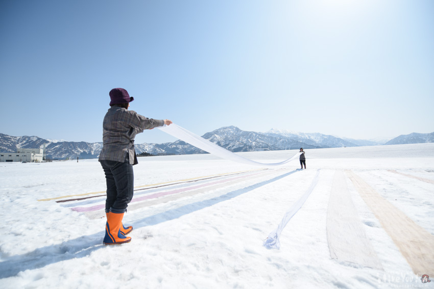 この「雪のなかで糸をつくり 、雪のなかで織り 、雪の水に洗い」は先に書いた織物のことで、「雪の上に晒す」がこの“雪さらし”である。